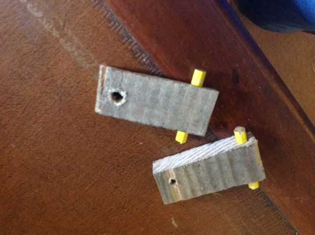 Cortar dos tiras de lápiz para actuar como la bisagra. Dos perforaciones en cada pedacito de madera uno un t cada extremo uno atravesando de arriba a abajo y de lado a lado. El agujero vertical permitirá que los cables que pasar y son los agujeros horizontales para insertar los pencills para formar la bisagra. Consejos.