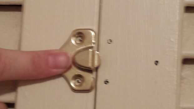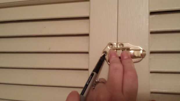 Coloque los dos lados de las capturas de cajón en el centro de la puerta bifold (la parte con bisagras) y marque los orificios de perforación. Puse las capturas hacia la parte superior de la puerta fuera del alcance de los niños.