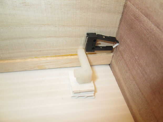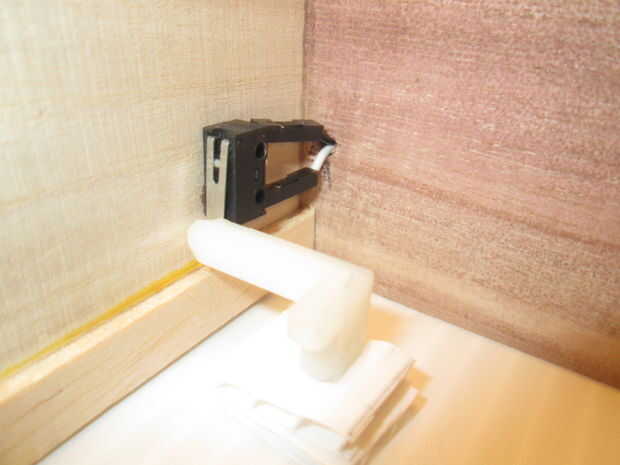Ahora es el momento de instalar el LED, interruptor de contacto y montar el circuito del controlador del motor servo. Esto tiene que hacer en este momento, así que puede probar el sistema de la polea y asegúrese de que la puerta se desliza abrir y cerrar libremente. Instalar las luces LED y switch de contacto. El interruptor de contacto debe colocarse en la esquina superior derecha de la caja, cortar un trozo pequeño de cola tablero plástico de la que el plástico del tablero así cuando los portaobjetos de la puerta, que hace contacto con el interruptor (véase pix 1, 2, 3, 4 y 5).