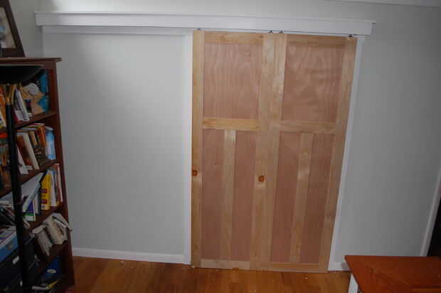 yo era cerrar parte de una habitación en mi casa para uso como taller y tuve que añadir algunas puertas.  Las dos maneras en eran unos 47" amplio así que no podía usar una puerta de 48" y no quiero usar una puerta más pequeña.  He construido dos umbrales: uno un slider de 48 pulgadas y uno con dos puertas de 24 pulgadas.  Las puertas ellos mismos son simples puertas de núcleo hueco con ajuste añadido de estilo craftsman.  El hardware es realmente bolsillo herrajes de puerta, instalados en el exterior.