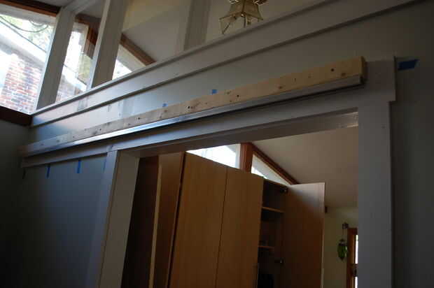 Hubo actual 1 x 6 moldura sobre la puerta, que extendió hasta la pared. Basado en la altura de la puerta y el hardware, una pieza de madera de 2 x 3 era el tamaño perfecto para montar el hardware de la puerta de bolsillo. Hubiera podido ripear un 2 x 4 para obtener el derecho de altura para los diferentes umbrales. Utilicé tornillos de 3,5 pulgadas para garantizar la madera de 2 x 3 1 x 6 y el panel de yeso en los postes de madera. La pista de puerta de bolsillo está instalada en el borde exterior de 2 x 3.