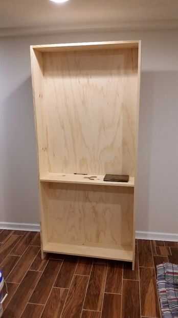 A continuación tienes que construir tú librería. La imagen de arriba muestra mi Swing en la librería. Los lados, superior, inferior y estante central son tablas de 1 "x 10" y la parte posterior es una hoja de lija en madera contrachapada de 1/2". Perforar los laterales para estantes movibles, pero quería el estante central fijado para mayor estabilidad. Mi Swing en Librería tiene patas pequeñas en el lado para hacer la parte inferior de la misma altura que los casos de Swing Out y dejar suficiente espacio montar ajuste en la parte inferior. Desempolve sus habilidades de geometría para averiguar cómo amplia sus estantes pueden ser y aún encaja limpiamente en el marco de la puerta o revisa mi wiki http://spider.dnsdojo.net/mediawiki/index.php/Bookcase_Door para encontrar unas calculadoras de mano.
