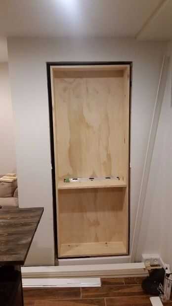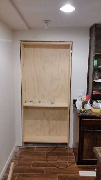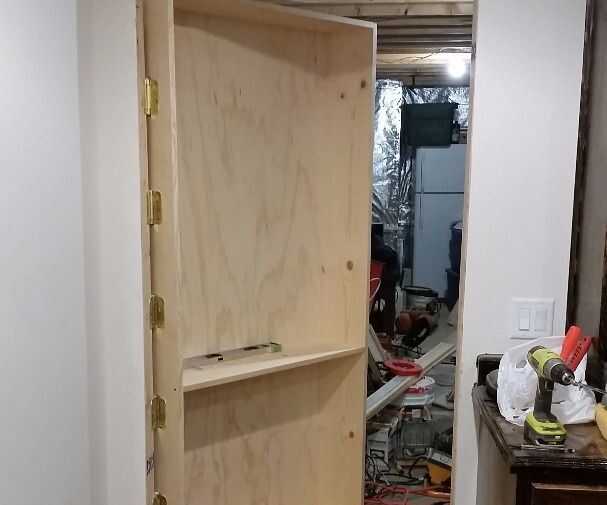 El paso siguiente es montar las puertas. Mi swing en puerta utiliza 5 bisagras de tope estándar, espaciadas uniformemente a lo largo de la estructura. Para maximizar el ancho de mi librería arena chuletas en el lado de la librería de la bisagra quedar al ras contra la caja. Puede ser más fácil montar una 1 "x 4" espaciador tira a las bisagras y entonces agregado la librería para que, pero reducirá el tamaño de su librería.