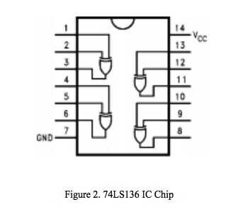También, el 74LS136 es una viruta del IC que se compone de 14 pernos; cuatro puertas XOR, un perno de tensión de alimentación (Vcc) y una tierra (GND) del pin. La tensión de alimentación (Vcc) es conectada al pin 14 y tierra (GND) se conecta al pin 7.