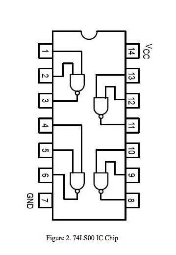 También, vamos a utilizar la viruta del IC 74LS00 para construir las configuraciones derivadas basados en NAND en un protoboard para confirmar los resultados. Nota que Pin #7 es tierra conectado y Pin #14 está conectado a la tensión de alimentación (5V).