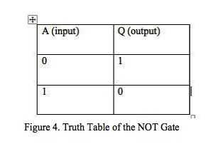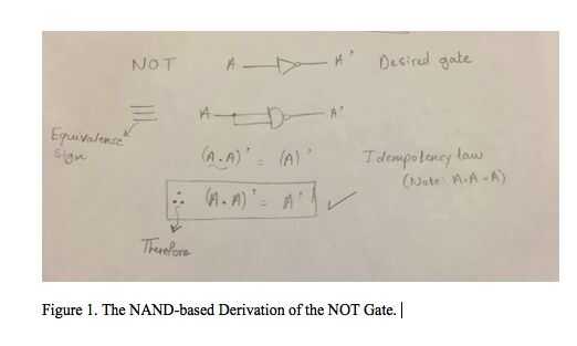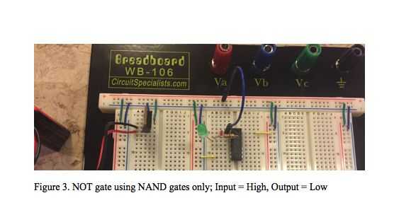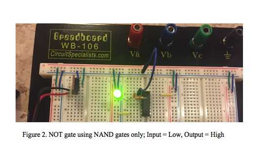 La derivación basados en NAND de la puerta no se muestra en la figura 1. También, es importante tener en cuenta que las entradas de las puertas NAND son conectadas juntos; la misma entrada. En la figura 2 y 3, se deriva la configuración basada en la NAND, las dos posibles entradas, cero y uno, fueron probadas, y se observaron los resultados. Por lo tanto, de los resultados, podemos concluir que insertar la entrada del mismo a través de una puerta NAND de 2 entradas tendrá como resultado el complemento de la entrada; negación lógica se implementa que está de acuerdo a la tabla de verdad de una puerta no que se muestra en la figura 4.