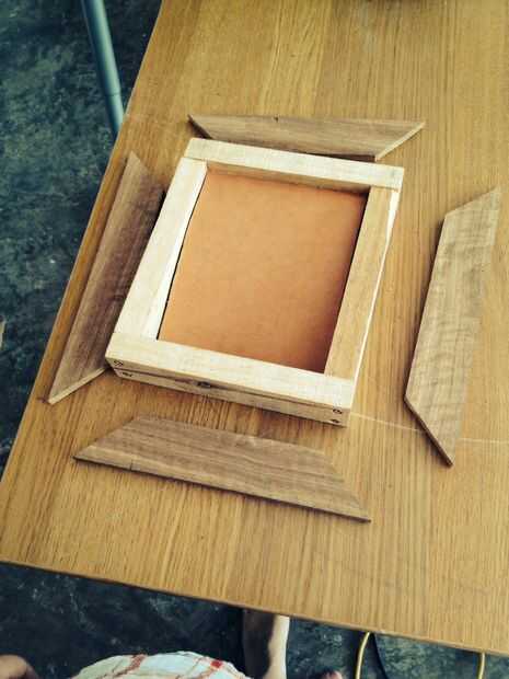 La imagen muestra bastante la construcción. Empezar con el marco interno por pegar una pieza de cuero a la pieza superior de la estructura (idealmente pegada en un ranura hecha con un router de corte-se olvidó de tomar una foto que lo siento). Utilice tornillos para fijar el marco interno.
