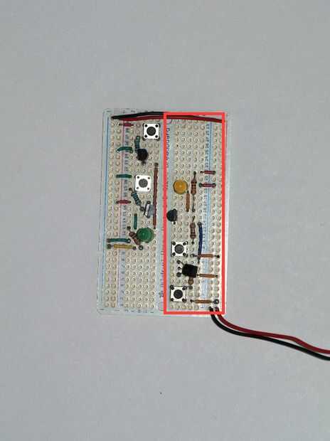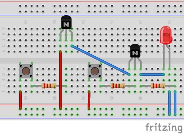 Así que pulsando los botones de acuerdo a la tabla de estado y por encima de las salidas puede ser recreado. Porque los 2 transistores se colocan en serie el circuito sólo se completa cuando se pulsan el botón A y B, y así se implementa la función AND.