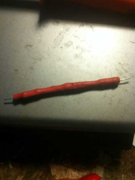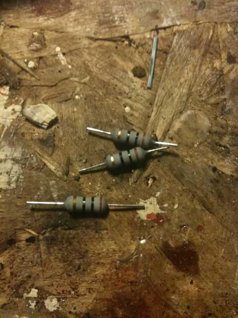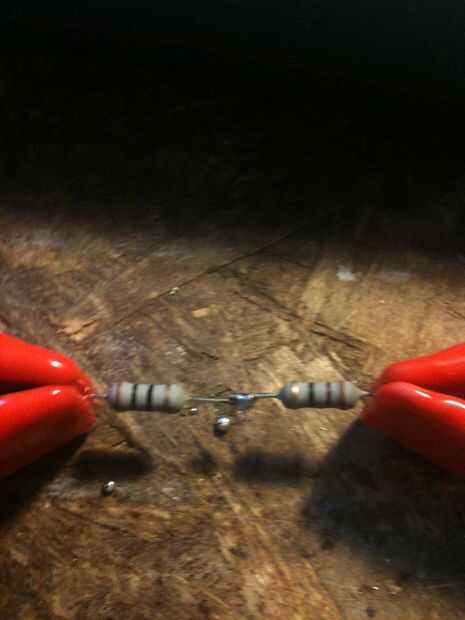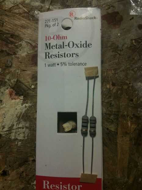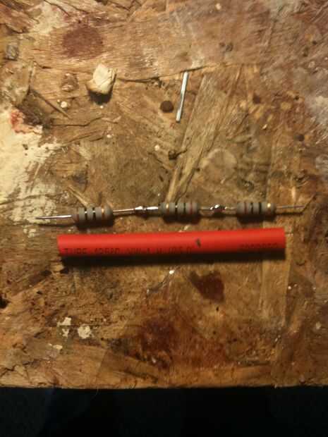 Tomar 3 resistencias de 10 ohmios a 1 vatio de Radio Shack (Radio Shack # 271-151, comprar 2 PACKS) les clip corto y les de la soldadura en serie. (sí, sé que mi soldadura apesta.) Cortar un trozo de tubería para cubrir la resistencia y el calor para reducir alrededor del encogimiento.