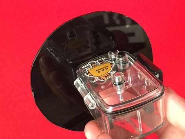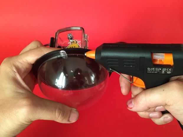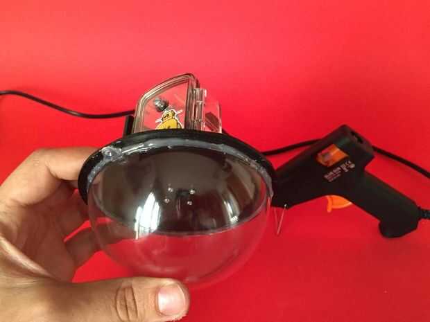 Una vez que la placa trasera está bien fijado a la carcasa resistente al agua podemos utilizar un montón de pegamento caliente para fijar la media bola plástica en su lugar.