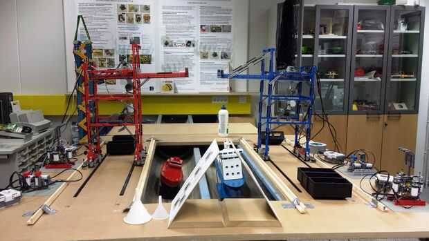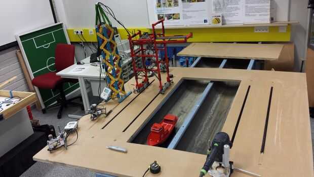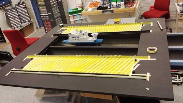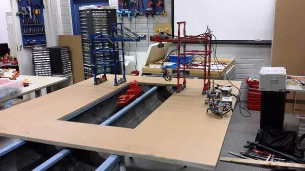 Los rieles de las grúas se hacen del "tren cremallera" - no sé la palabra adecuada para ello en inglés, pero es cerca de 20 cm largo de plástico con los dientes en él y en que los dientes de las ruedas Lego encaja perfectamente. Los rieles son molidos alrededor de 1 cm de profundo en la Junta y pegados para permanecer en el lugar. Las grúas también hicieron falta barras de madera adicionales para guiar su movimiento.