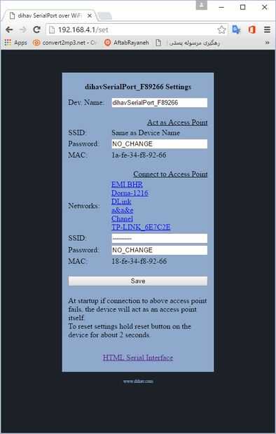 También puede conectar este dispositivo a un router en lugar de utilizar como un punto de acceso. Para hacer esta navegación sólo a la página de configuración de dispositivo escribiendo "192.168.4.1/set" en la barra de direcciones de su navegador de internet. En esta página, puede cambiar el nombre del dispositivo, contraseña de acceso al punto y especificar el router que quieres este dispositivo conectarse escribiendo su nombre y contraseña. Se recomienda asignar una dirección IP estática para este dispositivo si desea conectarse a un router. Para averiguar cómo hacer esto sólo tienes que buscar el internet para "Asignar la dirección IP estática". Tenga en cuenta que si este dispositivo se conecta a un router, la IP ya no es "192.168.4.1". Para restablecer todos estos ajustes botón "Restablecer contraseñas" en el dispositivo durante unos 2 segundos.