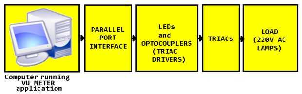 El proyecto utiliza el audio muy simple captura técnica de sistema informático. Una aplicación de visual basic de diseño que utiliza la biblioteca multimedia de windows que es utilizada por el sistema operativo windows para jugar y capturar las señales de audio a través del dispositivo de audio disponible en su sistema. Con la ayuda de esta biblioteca el software muestras el audio que se reproducen a través del canal de sonido y toma de decisiones se realiza en coche que las luces de LEDs conectadas al puerto paralelo del ordenador. La biblioteca "inpout32" se usa para acceder al puerto paralelo del ordenador. Así la aplicación de unidades las luces LEDs conectadas al puerto paralelo después de procesar las muestras de la señal de audio. Debido a la limitación de los pines de entrada/salida disponibles en el puerto paralelo, puede ser conducidas solamente ocho luces LED para mostrar la intensidad de volumen. La sección de software así es responsable solamente de generar señales de lógica a través del puerto paralelo para manejar las ocho salidas. El estado de luces y pantalla completa de VU para canales de audio izquierdos y derecho se muestra en la interfaz del software. La siguiente sección es la sección de la pantalla. Las señales de la lógica en el puerto paralelo se utilizan para conducir la sección de opto-acopladores que luego se utilizará para conducir los TRIACs y LEDs y así conducir la alimentación de 220V AC powered lámparas. Así en pocas palabras, la señal de la lógica generada por el software de acuerdo con el nivel de audio en el puerto paralelo conducirá el LED correspondiente y el opto-acoplador. El opto-acoplador interruptores encendido/apagado el TRIAC asociado y enciende la lámpara. Hay dos versiones del hardware asociado con el proyecto de la sección de la pantalla. Uno utiliza simples LEDs, mientras que la otra puede usarse para controlar lámparas de red 220V AC.