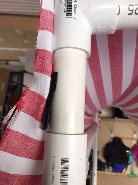 Sólo comprar algún Velcro y córtelas con las tijeras para hacer pequeñas tiras. Luego fije un lado para el PVC en varios lugares y luego pegar el otro lado a la cubierta y. También hacer lo mismo con la tela del carro y fijarlo a la mesa.