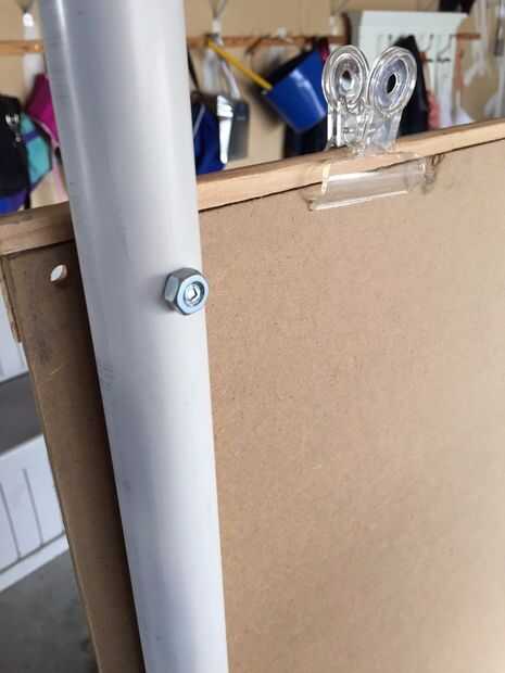 No hacer sus propios signos. Acaba de encontrar en una venta de garaje. Encontró con una pizarra de caballete infantil para $10, luego lanzó hacia fuera el caballete. Lo mismo para una seca al tablero del erase. Sujete a los lados. Esta manera, los niños pueden cambiar lo que están vendiendo por escribir un nuevo mensaje. Perfore a través de la PVC y fije con tornillos y tuercas.