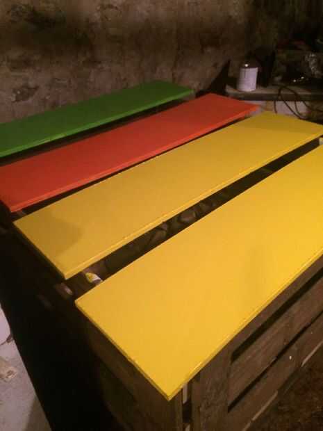 Amarillo sólo necesita una capa pero el naranja y verde tomó dos capas