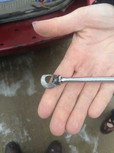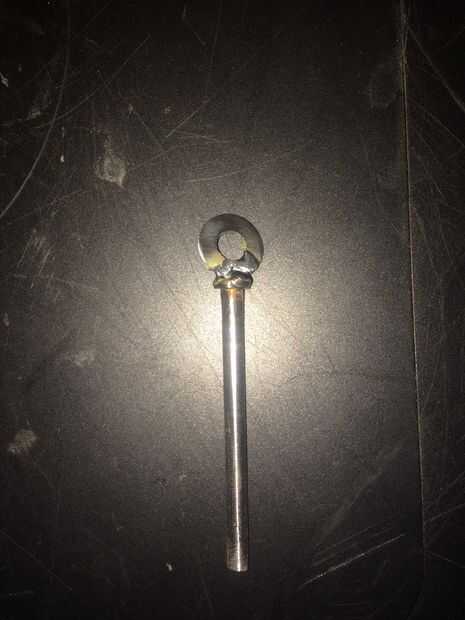 También soldada una arandela en la parte superior para que sea más fácil de agarrar y aplanado de un lado para que la lavadora no clavarse en la madera contrachapada