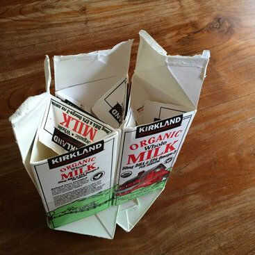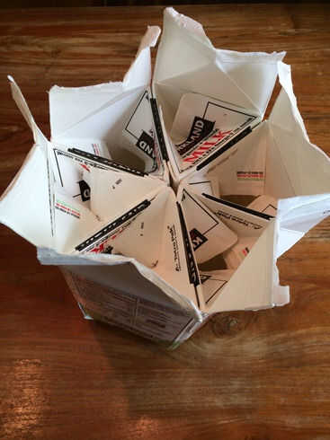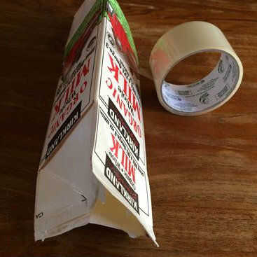 En primer lugar, recoger cartones de leche. Luego aclárelos y séquelos bien. A continuación, cortar abierto como en la imagen. A continuación convertirlos en tubos del triángulo como se ve aquí. Con cinta adhesiva. A continuación organizar en forma de hexágono con seis tubos del triángulo y la cinta juntos.