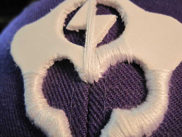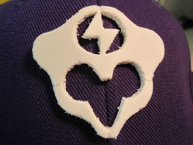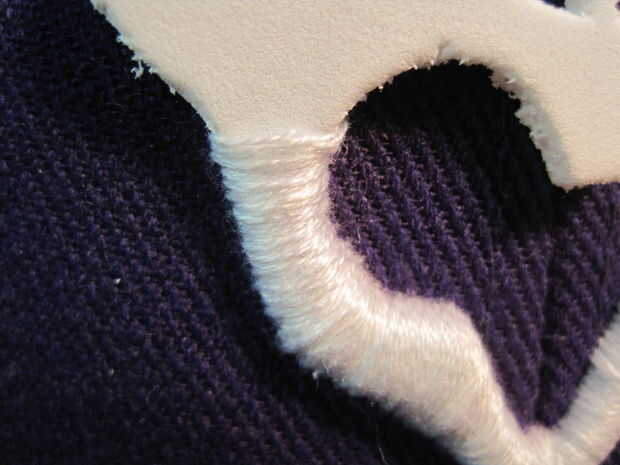 Una parte interesante del diseño era manejo la frente y el rayo. Para cubrir toda la espuma, un hilo fue entre los ojos, el rayo y la parte superior de la cabeza. Esta era la única forma que fácilmente podría cubrir la frente. Después de esto, hice una puntada diagonal en el rayo, debido a la forma de la rosca había presionado la espuma y había creado una pendiente. Puntadas horizontales se deslizó fuera de lugar y parecía extraños en la probeta.