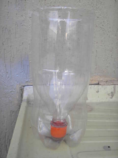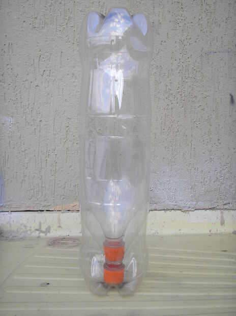 -Bem Feche una tampa de uma garrafa inteira não esteja amassada e encaixe, un no fundo conjunto montado anteriormente, como na foto. Novamente, assegure-se da centralização e do encaixe.