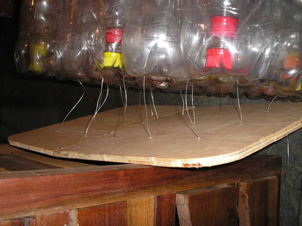 -Os passe arames pelos apoios e pelos vãos das garrafas e prenda no apoio lado oposto.