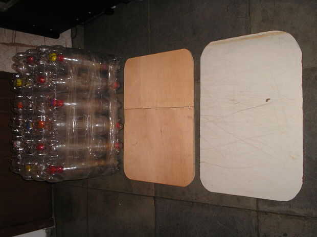 -Será necesarios dos piezas de madera para formar la cama. Lo ideal es que las piezas de tamaño del mismo sofá. Utilice estructura de botellas como guía para cortar los trozos de madera.