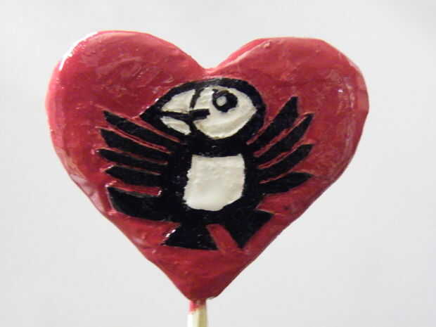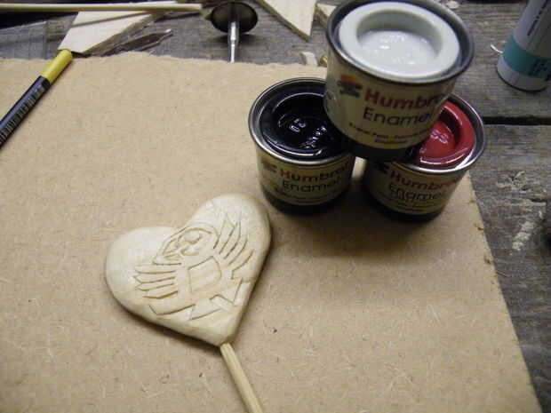 Utilicé pinturas de esmalte de Humbrol para decorar el encanto - blanco para los detalles del vientre y la cara, roja para el corazón sí mismo y negro para el frailecillo.