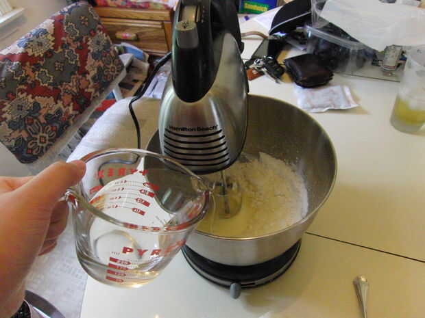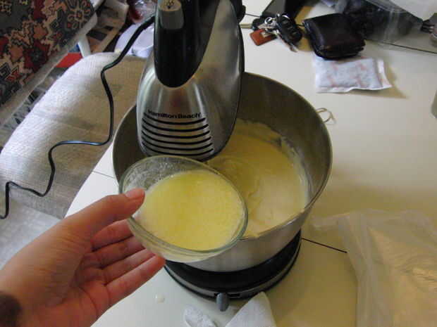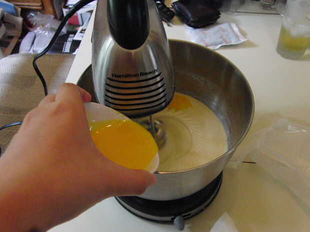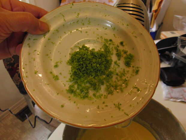 Precalentar el horno a 325 grados F. agregar la mezcla de pastel, agua y corteza de limón/lima. Mezclar hasta que quede suave. Añadir la yema de huevo y la mantequilla y mezclar durante 2 minutos más o hasta que se mezcle bien.