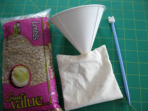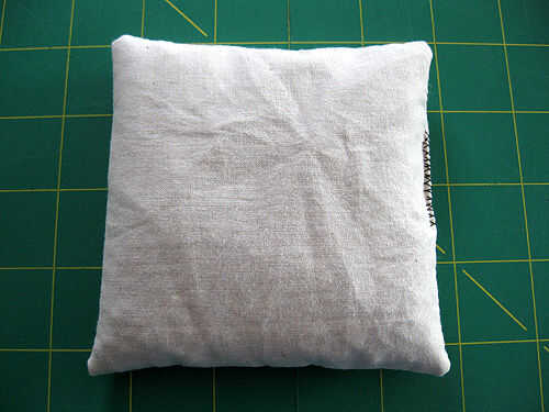 Muselina de vuelta saco de lado derecho hacia fuera, empujando suavemente hacia fuera de las esquinas con una aguja de tejer, palillo, bolígrafo o algo más puntiagudos. Poner el embudo en la abertura de la bolsa de muselina, dosificar y verter en el relleno. Utilice sólo sobre 3/4 de taza de relleno, o no serás capaz de encajar el saco en la tapa!
