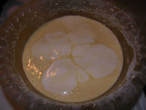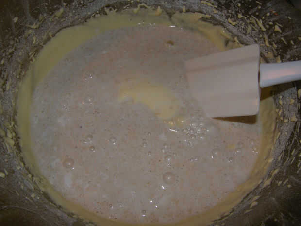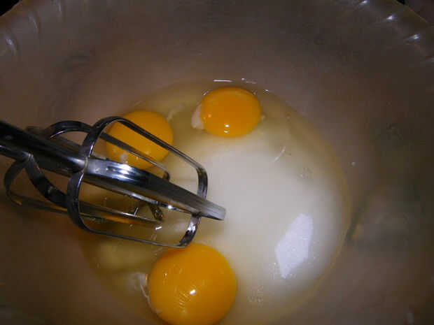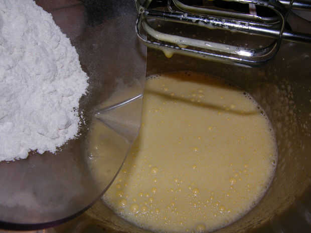 Batir azúcar y hasta suaves, luego venció en harina un poco hasta que combinado