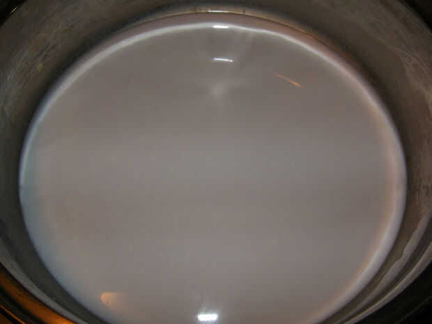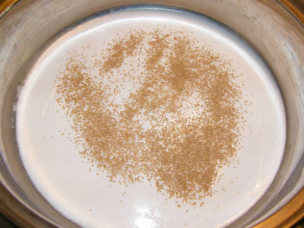 A fuego lento la leche de coco y luego sacar del fuego. Deje enfriar hasta tibia y espolvorear con la levadura, remover ligeramente y dejar florecer durante 10-15 minutos.