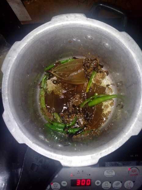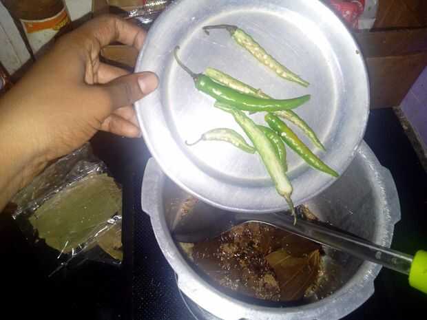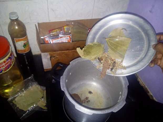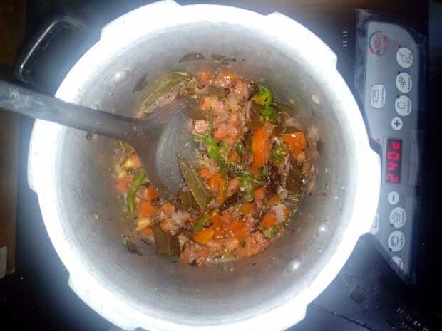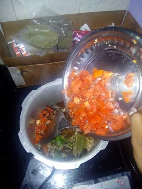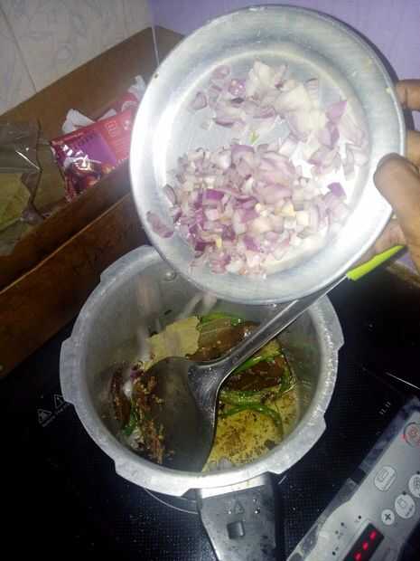 Luego tomar el artículo de Pulao (clavo de olor, canela, laurel, hoja de menta seca, hojas de alholva seca, semilla de hinojo semillas, brotes de Ceiba, amapola, kesari) y fríala por 50 segundos, después de que tome frío verde y la cebolla que ya se corta y freír en aceite durante 2 minutos. Después de el color de la cebolla va a cambiar en color dorado entonces usted necesita poner los trozos de tomate y freír un poco más de un minuto, y luego disminuir la temperatura de la estufa.