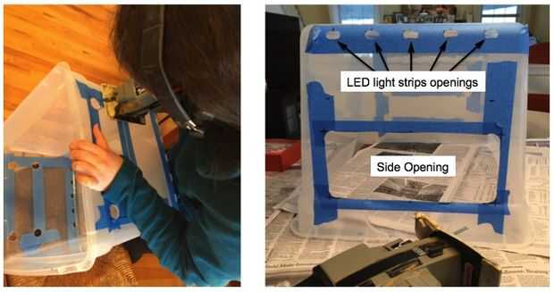 El primer paso es cortar las aberturas en el cubo de plástico para sujetar las tiras de luz LED y prever ventilación.