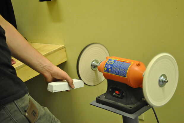 Antes de empezar a pulir, debe aplicar el compuesto a su rueda. Mientras gira la rueda, empuje lentamente el compuesto en la rueda hasta que tenga una capa delgada. Es mejor aplicar sólo compuesto un poco, pero a menudo, en lugar de un montón de compuesto a la vez. Si hay demasiado compuesto, no será tan eficiente de un proceso.