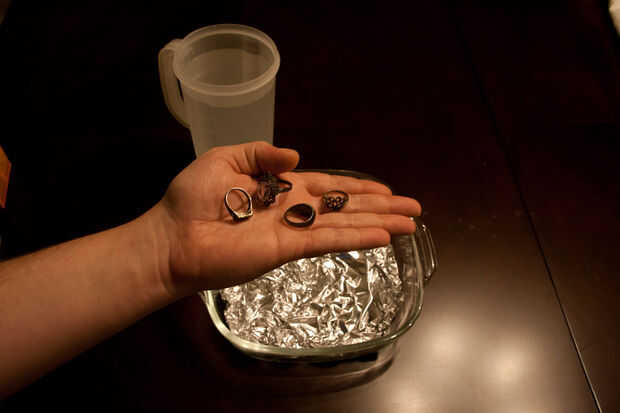 Nosotros hemos exitosamente limpiar joyería de manera no destructiva con muy poco esfuerzo. Como se puede ver en las imágenes adjuntas, esto funcionó muy bien en algunas joyas pesadamente manchada y vieja. El anillo más grande con la gran piedra preciosa fue restablecido, conservando su pátina intencional en las grietas del patrón pero parecía tan bueno al terminar que mi suegra le pasa antes de que podría conseguir una foto. Agradecimiento especial a Nurdrage por la inspiración detrás de esto.