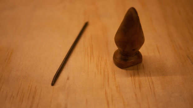 Primero compré un extremo de barra de cortina de madera y cortar los lados de la base para que no ruede lejos cuando puso en un banco o una pieza de mármol. Se verá como....... ... JAJAJA... Umm bueno sabe. Luego haz unos 3mm o 1/8 varilla de cocer a fuego lento. Esto es muy barato en una ferretería, tuve algunas gallinas alrededor así que corte un pedazo pequeño de 50mm o 2 pulgadas.