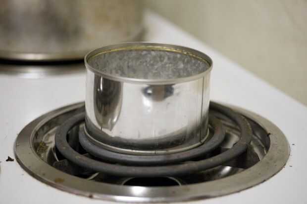 Asegúrese de quitar la etiqueta, no quiere coger el fuego. Además, recuerde lo que su mamá le dijo sobre las latas de lata; "cortan", doblado el borde de la mina con mi letherman. (después corté yo no prestar atención)