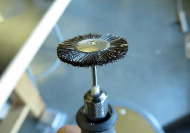 El ultimo paso de pulido es utilizar algunos compuesto para pulir. Utilice una rueda de cepillo con Trípoli (un compuesto previamente pulido) primera. Luego lavar su pasado bien antes de ir a rouge. Esto es para evitar que la rueda de rouge contaminando con Trípoli de sobra. Si tienes un limpiador sonic ultra, sumerja la pieza en agua de jabón caliente durante 5 minutos para deshacerse de la Trípoli.