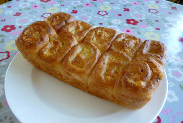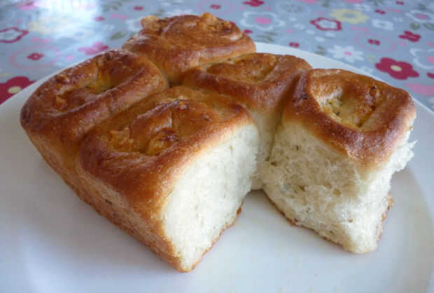 4. Corte el registro en diez trozos. Horneo en un molde forrado con papel de aluminio y pulido con aceite vegetal. Coloque las diez piezas de masa en la bandeja. Que prueba de nuevo por 30-45min, hasta que casi se duplicó.