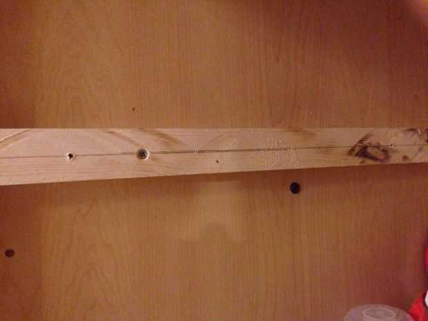 En este punto, pongo a mis espaciadores en el gabinete para perforar algunos agujeros para los tornillos que los espaciadores en. Usé dos doblado piezas de cinta del conducto como una tercera mano. Alineado el espaciador con la marca en el gabinete y utiliza un nivel de bala para asegurarse de que el espaciador fue recto a través de la forma. Una vez que se nivel, perforé dos agujeros guía a través del espaciador y en la pared del gabinete. Quité el espaciador, avellanado los agujeros (de modo que el soporte sería quedar), y puso 1-3/8" tornillos a través del espaciador hasta los puntos estaban hacia fuera. A encontrar los orificios piloto y atornillar al espaciador en la pared del gabinete.