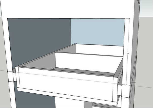 Fue nuevamente dentro de SketchUp y había averiguado la profundidad desde el frente del gabinete en la parte superior del espaciador y había marcado cada uno. Debido al espacio en el que tenía que trabajar, no se molestó con el dibujo que la parte posterior, y verás por qué en un momento. Si no tienes que lidiar con los espaciadores, te recomiendo averiguar donde desea que la parte superior de la plataforma, y luego añadir cualquier mitad de la altura del cajón.