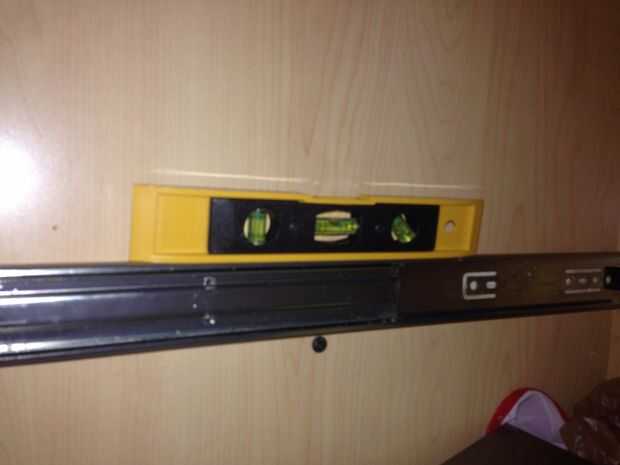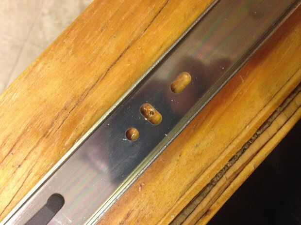Monte la pieza de cajón empujando suavemente hacia atrás en el soporte. Asegúrese de que usted está claro del todo (me enteré en este punto que mis diapositivas conexión realmente con el cajón, por lo que estoy agregando algunas cuñas para el lado de la puerta de las cosas.) Si no es bastante de nivel, o no fácilmente deslizante hacia adentro y hacia afuera, sólo ser paciente y repasar cada pulgada para ver dónde está el problema.