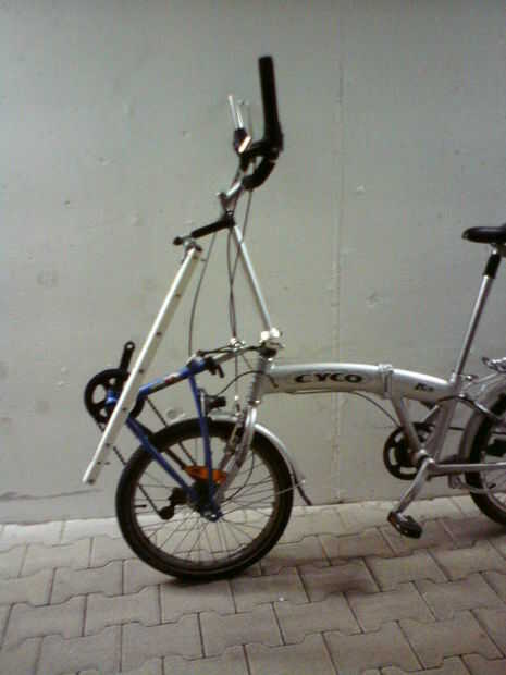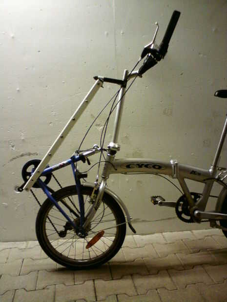 Mi bici plegable (como la mayoría) tiene una bisagra para doblar el tallo. Si tu moto no, luego el tallo y fije una bisagra conveniente (se explica cómo hacer una bisagra en).