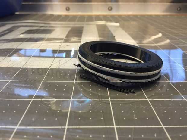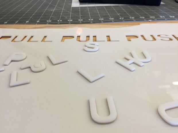 Nuestro primer intento de hacer esto era 3D imprimir un anillo inferior de resolución en el 450 de Fortus y lasercut algunas letras de acrílico, a través de los esfuerzos de Jimmy y Shantell. Poco las lengüetas de la ranura de T fueron súper pegadas a la parte inferior de las letras, pero rectangular-ness del láser cortar no encajaba bien con la ranura en T redondeada. Mejor tolerancia podría han ha tenido.