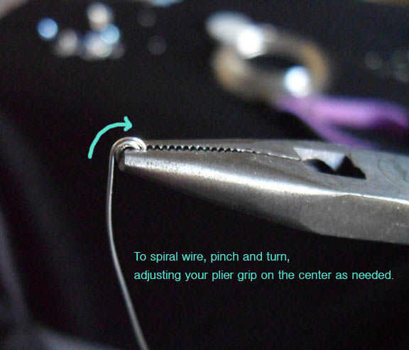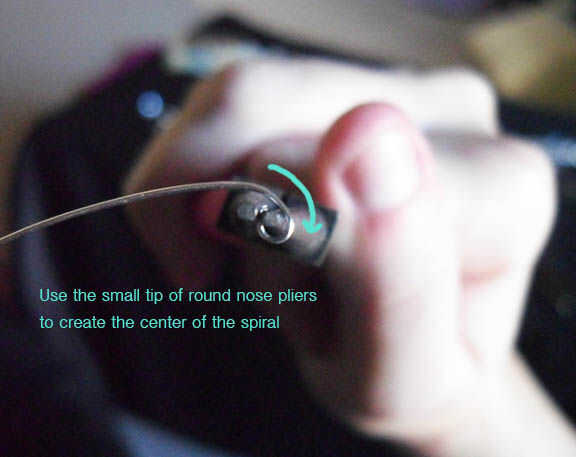 Utilizar alicates de punta redonda para iniciar el espiral en el extremo de su cable. Sujete el extremo del alambre entre las pinzas y gire suavemente para crear una curva de. Trabajar tan cerca de las puntas de la pinza como sea posible, para mantener el centro de la espiral pequeña y delicada.