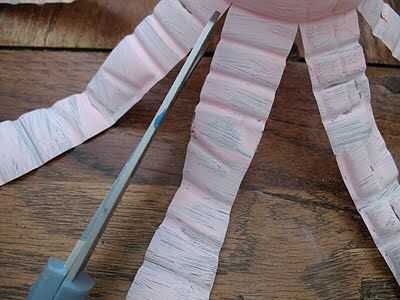 Cuando la pintura esté seca, utilice tijeras para cortar tiras en la botella. Iniciar en la parte inferior y van hasta cerca de 3 pulgadas desde la parte superior, deja suficiente espacio para la cabeza.
