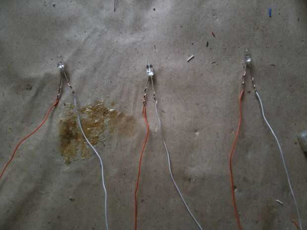 I cortar todos mis cables a más o menos la misma longitud, había despojado de los extremos y había herida alrededor de los LEDs. Me aseguré de mantener el color de codificación de la misma al pos/neg sobre los LED!