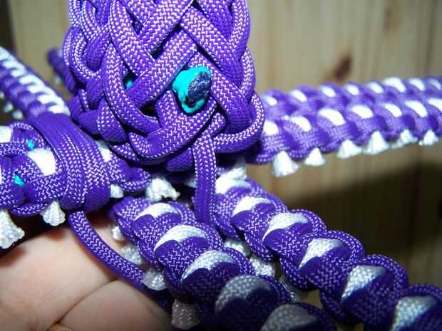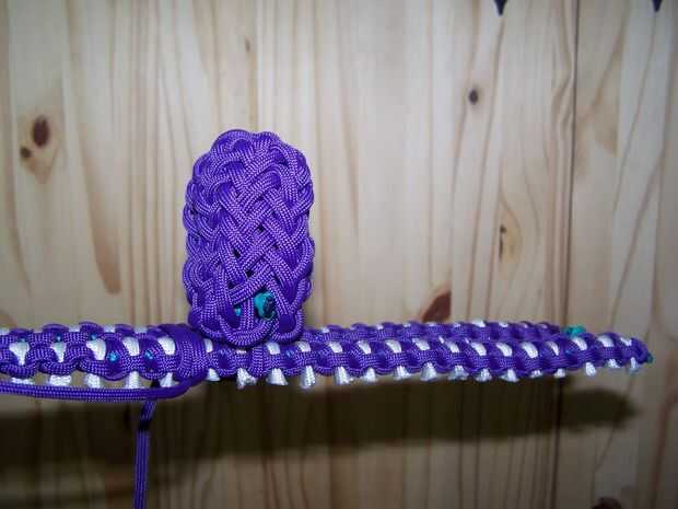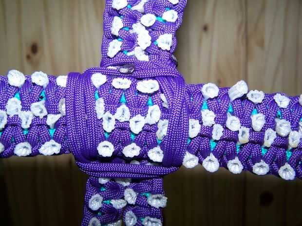 Luego cortar y los extremos de la chamusquina. Corte 3' pedazo de cordón morado y un ballestrinque justo debajo de eso primer nudo de corbata. Se trata de la