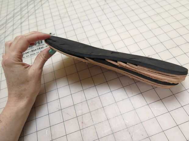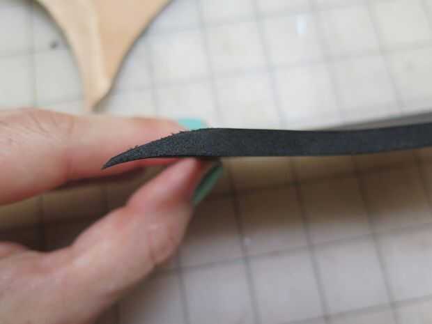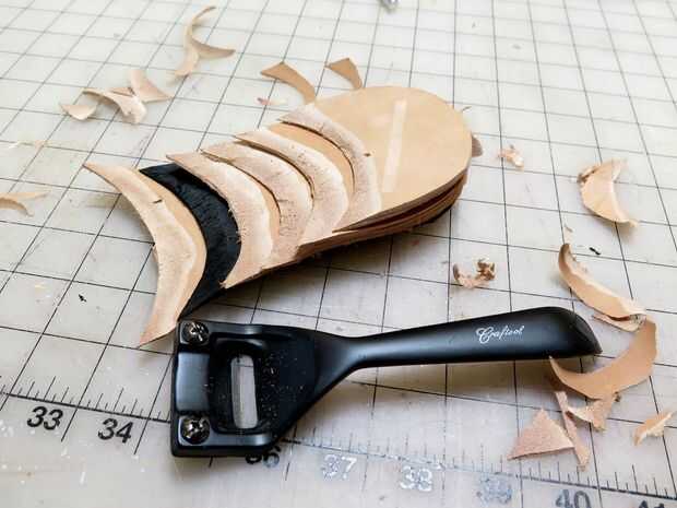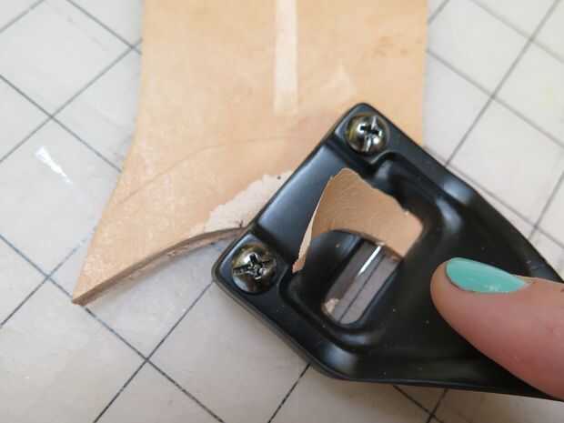 Utilicé mi herramienta de rebajar en los lados interiores curvados de mis piezas de cuero tacón cónico por lo que cada uno a un borde fino.