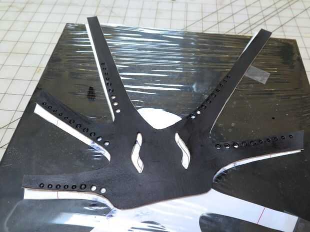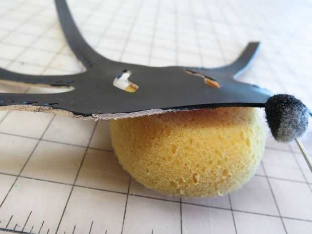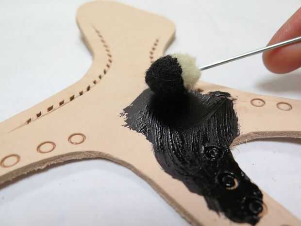 Este tinte de cuero funciona mucho mejor que algunos de los otros que he probado y el negro fácilmente da un perfecto acabado opaco en una o dos capas. Utilicé una esponja de lana a mi tinte sobre el frente, los bordes y la parte posterior de cada pieza de pulpo de cuero y un pincel para asegurarse de que estaba haciendo tinte en todos los detalles estampados y perforado de agujeros.